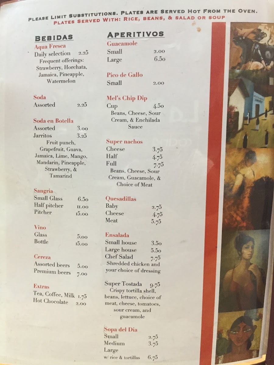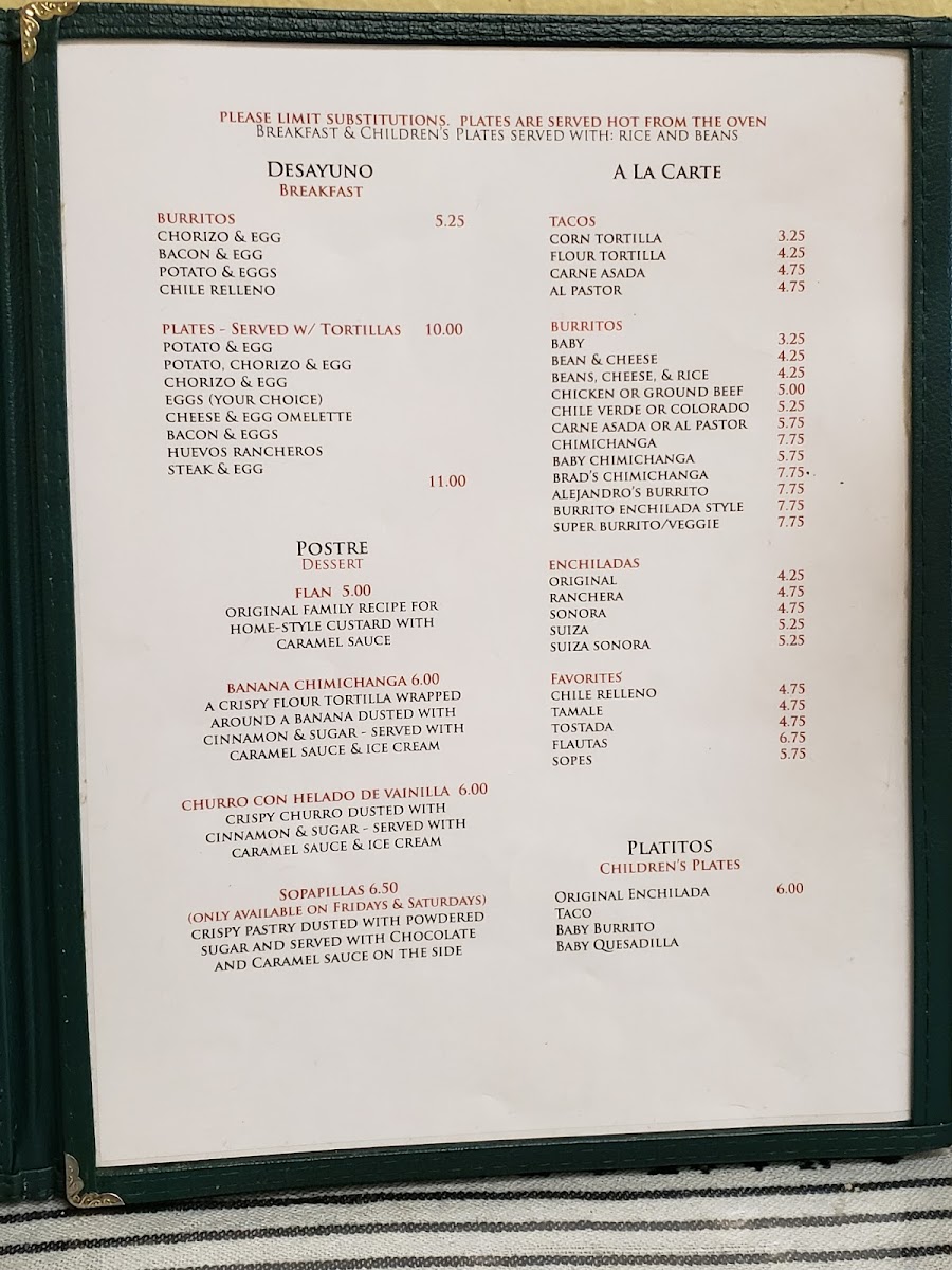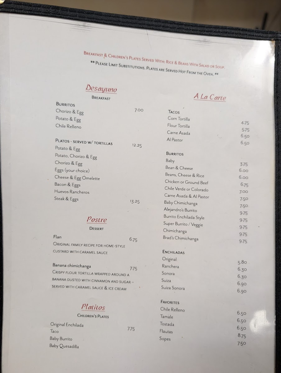 The menu also features lighter options like taco salads and individual tacos al pastor, perfect for a casual bite any time of day. Sweet touches like the banana chimichanga balance the savory offerings, while beverages range from refreshing aguas frescas to traditional hot chocolate and a modest selection of wines.